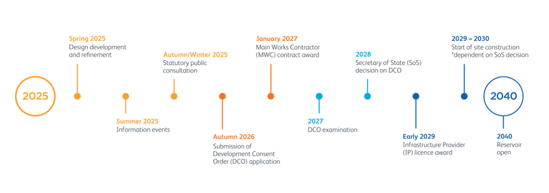 We intend to submit an application for a Development Consent Order (DCO) in 2026, seeking permission to construct and maintain the new reservoir. If granted, construction is forecast to begin in 2029 with the reservoir planned to begin operating in 2040. The planning process will allow people to have their say on the proposed new reservoir before a final decision is made by the Secretary of State. Demonstrating that we have had regard to local and regional concerns is an important part of the DCO process. Before formally applying for a DCO, Thames Water must carry out a public statutory consultation and consider feedback.